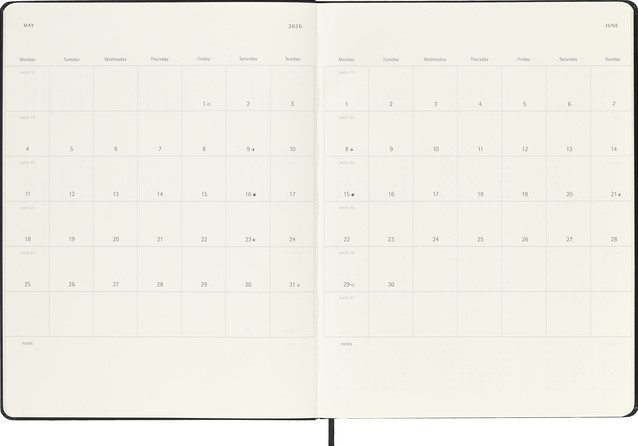De Moleskine 18 Maanden Weekly Notebook Planner loopt van juli tot december. Deze populaire planner is ingedeeld om de afspraken van de week aan de linkerkant weer te geven en heeft een gelinieerde pagina voor notities en ideeën aan de rechterkant. Hierdoor is het notebook perfect voor studenten, docenten en professionals. De planner heeft een harde of zachte kaft met afgeronde hoeken en een elastische sluiting.