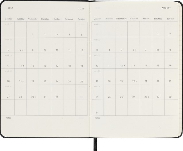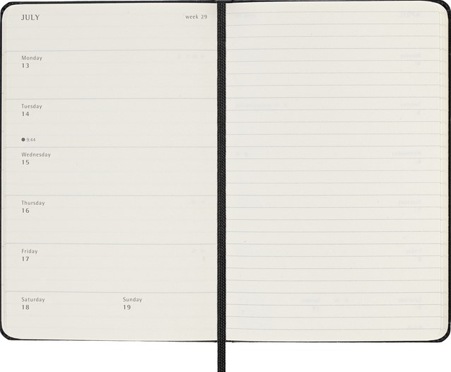 De Moleskine 18 Maanden Weekly Notebook Planner loopt van juli tot december. Deze populaire planner is ingedeeld om de afspraken van de week aan de linkerkant weer te geven en heeft een gelinieerde pagina voor notities en ideeën aan de rechterkant. Hierdoor is het notebook perfect voor studenten, docenten en professionals. De planner heeft een harde of zachte kaft met afgeronde hoeken en een elastische sluiting. - Harde kaft - Afgeronde hoeken - Elastische sluiting - Moleskine ivoorkleurig papier - Papiergewicht: 70 g/m² - Handige tools: planning, tijdzones, internationale metingen, toegangscodes en vluchtduur - Wereldwijde feestdagenkalender verkrijgbaar via moleskine.com/diaryaddons - Uitbreidbaar binnenvak passend bij de kleur van het notebook - "In geval van verlies" label gedrukt op het schutblad - Bijpassende bladwijzer voor lint - Herbruikbare paperband B-SIDE met extra gedrukte tools - 180° liggende opening - Moleskine srl. creëert en verkoopt FSC-gecertificeerde producten