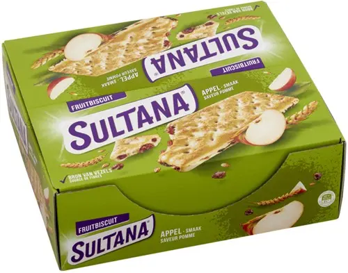 Sultana FruitBiscuit appel is een heerlijk tussendoortje boordevol met rozijnen, tarwe en een fruitige smaak van appel. Handig per 3 stuks verpakt.