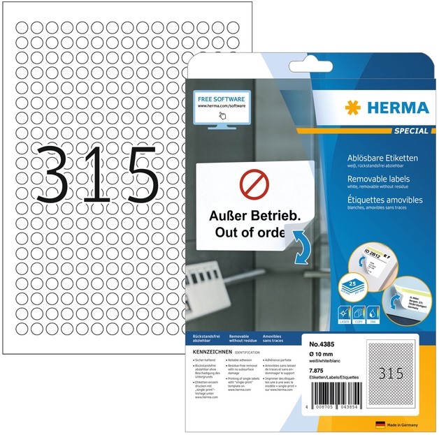 Zelfklevende etiketten op A4-vellen, verwijderbaar, 7875 etiketten / 25 vel · Stevig hechtend op alle gladde, droge, onbeschadigde en stofvrije oppervlakken · Te verwijderen zonder resten achter te laten en zonder de ondergrond te beschadigen · Ideaal voor het tijdelijk of wisselend labelen en voor oppervlakken die niet mogen worden beschadigd · Zeer goede drukresultaten op alle laser- en inkjetprinters, kopieerapparaten, kleurenlaserprinters en kleurenkopieerapparaten · Storingvrije verwerking dankzij veiligheidsrand rondom en optimale vlakligging · Milieuvriendelijk: FSC® Mix Credit-gecertificeerd, chloorvrij gebleekt, oplosmiddelvrije contactlijm · Etiketten zijn 100 % recyclebaar via het oud papier, verpakking van gerecycled karton · Gratis softwareoplossingen: www.herma.com/software