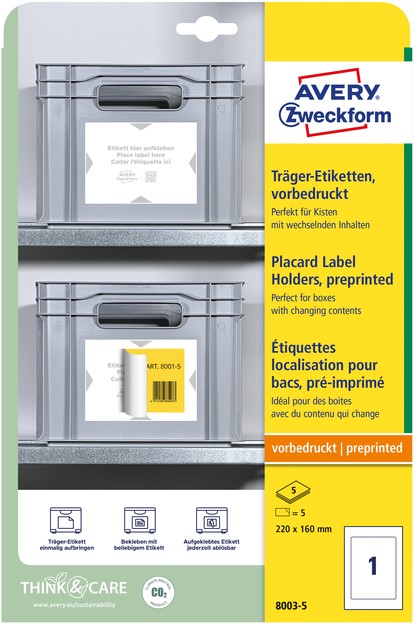 Voorbedrukte Positioneeretitketten, wit 220 x 160mm. Witte draagetiketten met grijze opdruk voor een vaste positie op kratten met steeds wisselende inhoud. Perfecte ondergrond om tijdelijke etiketten telkens opnieuw overheen te plakken. Dankzij de speciale oppervlaktecoating kunnen de tijdelijke labels residuvrij verwijderd worden Overzichtelijke, duidelijke en uniforme etikettering op een vaste plaats Ideaal voor plastic bakken, voorraadkratten en containerdozen in magazijnen en de logistiek.