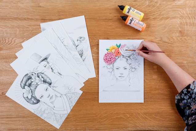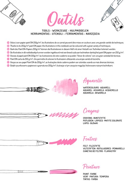 Of je nu fan bent van kleurpotloden, stiften, aquarel of andere verf, dit blok is je beste vriend! Het boek bevat zes prachtige illustraties, die elk drie keer worden herhaald. Zo krijg je de kans om verschillende kleurtechnieken en -stijlen te ontdekken. Er is ook een blad bijgevoegd met handige tips en een inspiratieblad om je creativiteit een boost te geven! Spiraalblok A4+ met 20 vellen Paint'ON papier van 250g (6 illustraties x3 + 1 blad met accessoires + 1 inspiratieblad). De vellen zijn microperforeerd en afscheurbaar (afmeting na afscheuren: A4). Omslag in gekorreld papier voorzien van ophangstrip.