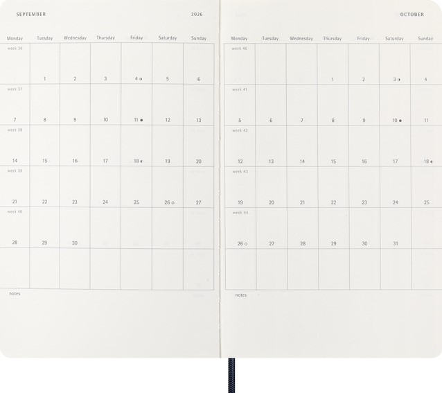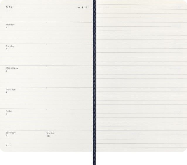 De Moleskine Weekly Notebook Planner is gedateerd van januari tot december. Het is een handige en veelzijdige planner die de vrijheid van een notitieboekje bevat en is ingedeeld met de afspraken van de week aan de linkerkant en een gelinieerde pagina voor notities op de rechter bladzijde. Het notitieboekje is beschikbaar met een harde of een zachte kaft met afgeronde hoeken en een elastische sluiting. - Zachte kaft - Afgeronde hoeken - Elastische sluiting - Moleskine ivoorkleurig papier - Papiergewicht: 70 g/m² - Handige tools: planning, tijdzones, internationale metingen, toegangscodes en vluchtduur - Uitbreidbaar binnenvak passend bij de kleur van het notebook - "In geval van verlies" label gedrukt op het schutblad - Bijpassende bladwijzer voor lint - Herbruikbare paperband B-SIDE met extra gedrukte tools - 180° liggende opening - Moleskine srl. creëert en verkoopt FSC-gecertificeerde producten