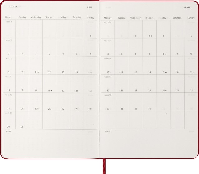 De Moleskine Weekly Notebook Planner is gedateerd van januari tot december. Het is een handige en veelzijdige planner die de vrijheid van een notitieboekje bevat en is ingedeeld met de afspraken van de week aan de linkerkant en een gelinieerde pagina voor notities op de rechter bladzijde. Het notitieboekje is beschikbaar met een harde of een zachte kaft met afgeronde hoeken en een elastische sluiting.