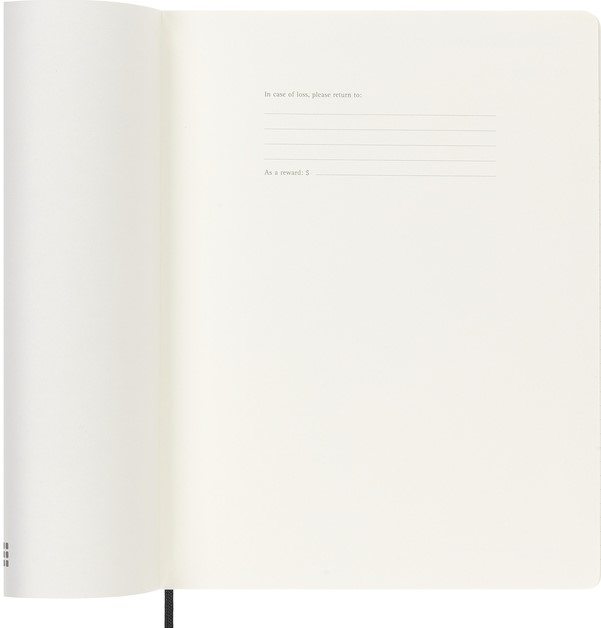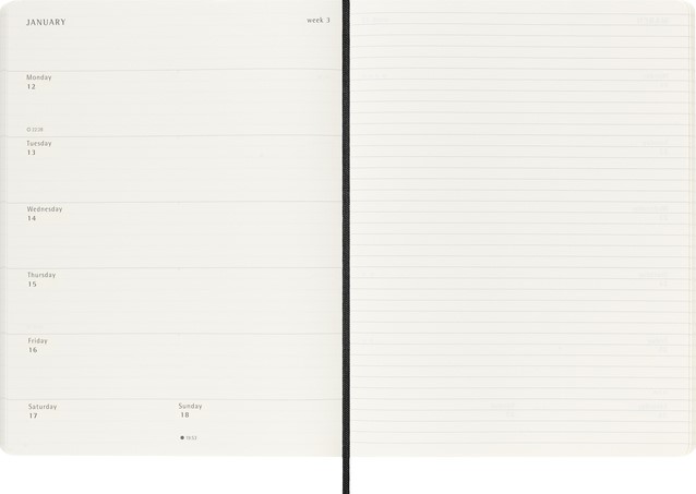 De Moleskine Weekly Notebook Planner is gedateerd van januari tot december. Het is een handige en veelzijdige planner die de vrijheid van een notitieboekje bevat en is ingedeeld met de afspraken van de week aan de linkerkant en een gelinieerde pagina voor notities op de rechter bladzijde. Het notitieboekje is beschikbaar met een harde of een zachte kaft met afgeronde hoeken en een elastische sluiting. - Zachte kaft - Afgeronde hoeken - Elastische sluiting - Moleskine ivoorkleurig papier - Papiergewicht: 70 g/m² - Handige tools: planning, tijdzones, internationale metingen, toegangscodes en vluchtduur - Uitbreidbaar binnenvak passend bij de kleur van het notebook - "In geval van verlies" label gedrukt op het schutblad - Bijpassende bladwijzer voor lint - Herbruikbare paperband B-SIDE met extra gedrukte tools - 180° liggende opening - Moleskine srl. creëert en verkoopt FSC-gecertificeerde producten