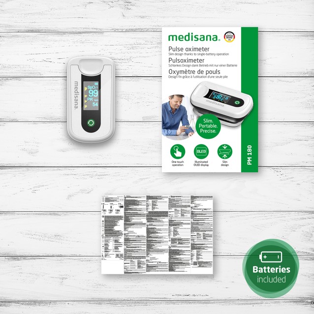 Slank ontwerp dankzij één batterij tijdens gebruik - met een gewicht van slechts 36 g inclusief batterij is de PM 180 bijzonder licht en handig. Naast de pulsoximeter bevat de levering ook een polsband, een etui en een batterij. Het apparaat is dus direct klaar voor gebruik. Het gecertificeerde medische apparaat biedt een betrouwbare en gebruiksvriendelijke oplossing voor iedereen die zijn gezondheid eenvoudig en gemakkelijk wil controleren.