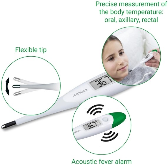 Meten kan oraal, rectaal of onder de oksel, in °C of in °F en is dankzij de flexibele punt een stuk prettiger in gebruik. Bij de start en het einde van iedere meting geeft de TM 700 een signaal, en na 10 minuten schakelt deze zichzelf weer uit. Gebruiksvriendelijkheid die kenmerkend is voor Medisana producten en tevens de batterij spaart. Zo weet u zeker dat u kunt meten die enkele keer per jaar dat u een thermometer nodig heeft.