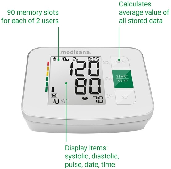 De BU 512 bovenarmbloeddrukmeter van medisana maakt indruk met zijn ongecompliceerde bediening. Het digitale display informeert u in één oogopslag over de datum, tijd, polsslag, systole en diastole. De huidige meetwaarden worden geëvalueerd met behulp van een stoplichtkleurenschaal. Indien gewenst kan het apparaat een gemiddelde waarde berekenen van alle opgeslagen metingen. De BU 512 bovenarmbloeddrukmeter van medisana heeft ook een display dat een onregelmatige hartslag kan aangeven.