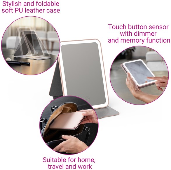 De spiegel wordt geleverd met een elegante, opvouwbare beschermhoes van zacht PU-leer. Makkelijk op te bergen en ideaal voor reizen of op kantoor.