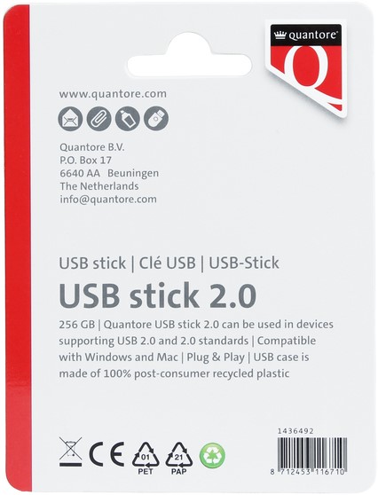 Bewaar en deel je bestanden eenvoudig met de USB-stick van Quantore. Met 256GB opslagcapaciteit en USB 2.0-technologie is deze stick ideaal voor het opslaan en overzetten van documenten, foto's en video's. De compacte, lichtgewicht behuizing is gemaakt van 100% gerecycled plastic en voorzien van een beschermkapje voor extra duurzaamheid. Dankzij Plug & Play is de USB-stick direct klaar voor gebruik op zowel Windows- als Mac-apparaten. Kenmerken:
