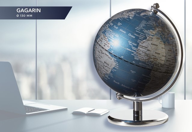 De glanzende wereldbol, met een diameter van 13 cm, heeft een verfijnd tweekleurig ontwerp met zilverkleurige landoppervlakken en een metallic blauwe zee.