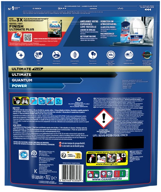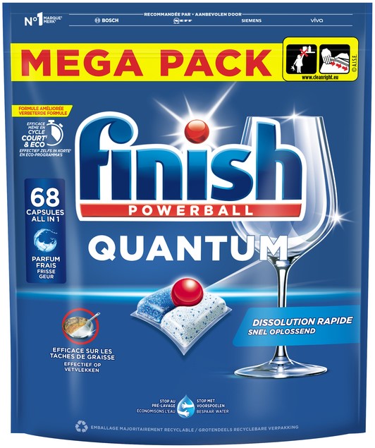 Met Finish Quantum regular all in one vaatwascapsules krijg je bij elke wasbeurt vanaf de eerste keer een diepe reiniging en een stralende glans! De capsuletechnologie met drie compartimenten verwijdert alle soorten voedselresten - zonder dat je je vaat hoeft voor te spoelen. Het poeder en de gel werken om residu los te maken en te verwijderen. De Powerball beschermt het glas en helpt de glans van je servies te behouden. Dit alles met 25% minder chemicaliën dan onze klassieke Finish compacte poedertabletten.