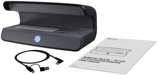 Inhoud verpakking; Safescan 75 LED, USB-C kabel, USB-A converter, handleiding.