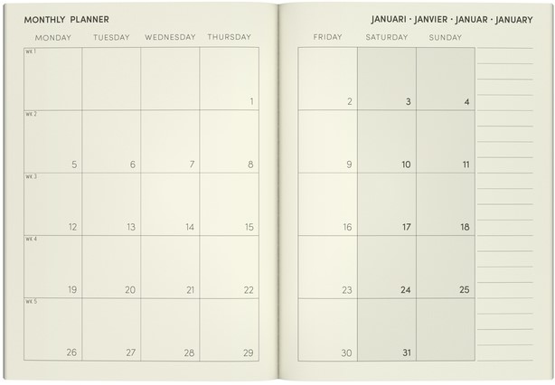 Met deze mooie 'Midnight Blush' Gradient agenda, hou je al je afspraken overzichtelijk bij de hand! Binnenin vind je telkens 7 dagen op 2 pagina's, een maandplanner en ruimte voor nota's, op crèmekleurig papier. Het binnenwerk is in het Nederlands, Frans, Duits en Engels. De harde kaft heeft een matte finish en een praktische elastische sluiting om alles op zijn plek te houden