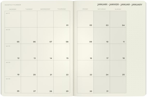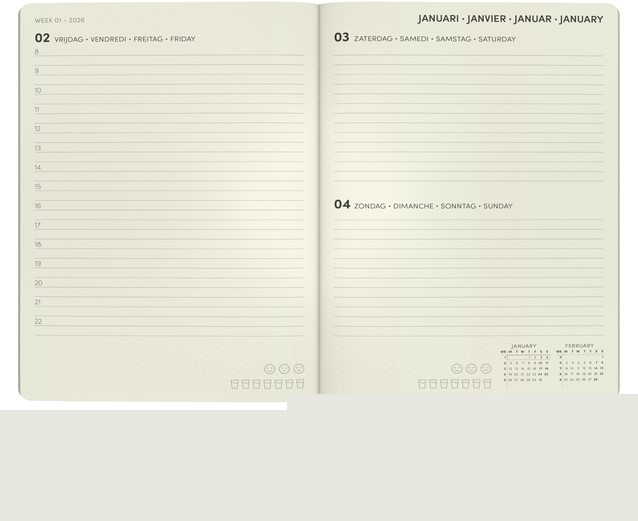 Met deze praktische QC Colour 'Deep Green' A5 agenda, hou je al je afspraken overzichtelijk bij de hand, en heb je dankzij het grotere formaat plaats genoeg om alles te noteren. Binnenin vind je telkens 1 dag per pagina ingedeeld van 8h tot 22h en ruimte voor notities en een maandplanner. Het binnenwerk is in het Nederlands, Frans, Engels en Duits. De harde kaft heeft een matte finish & afgeronde hoeken.