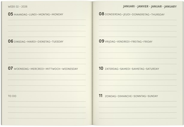 Met deze dromerige 'Flowers Watercolour' agenda, hou je al je afspraken overzichtelijk bij de hand! Binnenin vind je telkens 7 dagen op 2 pagina's, een maandplanner en ruimte voor nota's, op crèmekleurig papier. Het binnenwerk is in het Nederlands, Frans, Duits en Engels. De harde kaft heeft een matte finish, een elastiek en de agenda is voorzien van een praktisch leeslint.