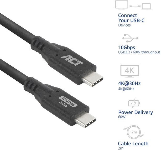 Kabel ACT USB-C 3.2 GEN.2 M/M zwart 2 meter 1 Stuk