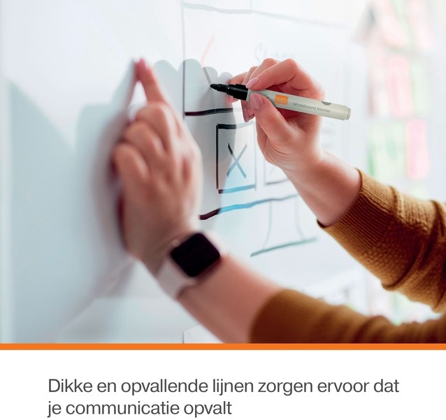 Verbeter jouw presentaties en samenwerkingssessies met deze veelzijdige whiteboardmarkers voor dagelijks gebruik. Deze droog uitwisbare markers zijn ideaal voor gebruik op kantoor, op school en thuis. Ze maken dikke, duidelijke lijnen en zijn geschikt voor gebruik op niet-poreuze oppervlakken zoals staal, glas en emaille. Deze zwarte markers hebben een ronde punt van 3 mm, waardoor je consistente, vloeiende lijnen kunt tekenen voor een duidelijk en netjes schrijfresultaat. De inkt droogt snel en is geurarm. De 4 zwarte whiteboardmarkers zijn gemaakt van 85% post-consumer gerecycled plastic (alleen de huls). Voor optimale prestaties gebruik je ze het beste met met een Nobo whiteboard. Verpakking met 4 droog uitwisbare markers.Whiteboardmarker maakt dikke, duidelijke lijnen, zodat de communicatie op het whiteboard opvalt.De huls is gemaakt van 85% post-consumer gerecycled plastic.Droog uitwisbare markers met een ronde punt van 3 mm voor consistente, vloeiende lijnen.Duidelijk en netjes schrijven met snel drogende en geurarme inktGeschikt voor whiteboards en niet-poreuze oppervlakken zoals glas, email en staal.Voor optimaal resultaat gebruik je de markers het beste met met een Nobo whiteboard.Verpakking met 4 zwarte whiteboardmarkers.