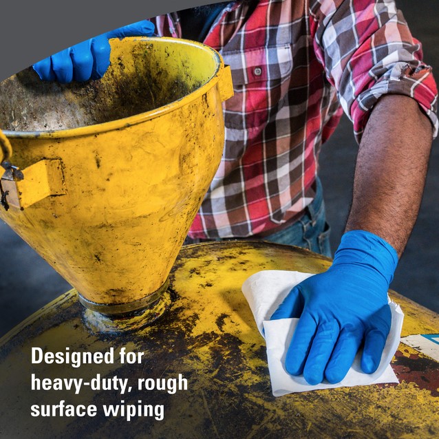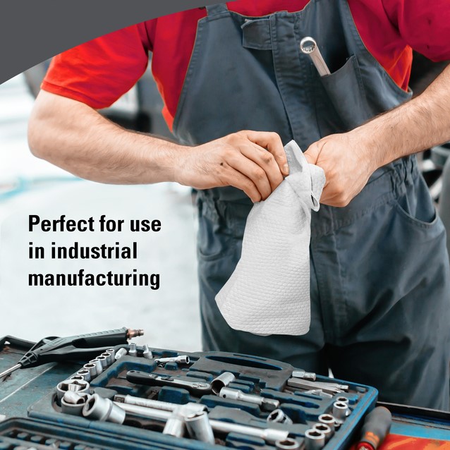 Van het opvegen van vuil, olie en vet tot het opruimen van gemorste vloeistof bij voedselbereiding, het is van cruciaal belang dat u de juiste doek bij de hand hebt. WypAll® is een schoon, absorberend en duurzaam alternatief voor papieren handdoeken, poetsdoeken en werkplaatshanddoeken. Het biedt een breed scala aan taakspecifieke poetsdoeken die zijn ontworpen om te voldoen aan de behoeften van uw branche en uw vertrouwen te vergroten bij elke reiniging. De Power Clean™-reeks is speciaal ontworpen voor het zwaarste werk - van zwaar schoonmaakwerk tot pluisvrije voorbereiding van oppervlakken voor industrieel gebruik. De taakgerichte WypAll® X80-poetsdoeken scheuren niet en behouden hun kwaliteit en formaat. Van de gebruikers is 70% onder de indruk van de duurzaamheid van de absorberende poetsdoeken, waarmee ze door 3 keer zo veel gebruikers worden geprefereerd boven eenvoudigere doeken. e geavanceerde Hydroknit™-technologie zorgt ervoor dat elke witte poetsdoek sterk en duurzaam is en snel absorbeert. De sterkte die we bieden, is toonaangevend. Ons doel is u te ondersteunen bij het verbeteren van de productiviteit en efficiëntie, en tegelijkertijd de hoeveelheid afval te verminderen door schone, betrouwbare en herbruikbare poetsdoeken te leveren. Deze absorberende poetsdoeken worden verkocht in een beschermende plastic zak om het product te beschermen tegen vuil. Doek-voor-doek afgifte zorgt ervoor dat gebruikers alleen de poetsdoek aanraken die ze gebruiken. Het helpt bovendien het gebruik onder controle te houden, de hygiëne te verbeteren en afval te verminderen. De poetsdoeken voor het reinigen van oppervlakken zijn bovendien gecertificeerd voor contact met voedsel. De witte poetsdoeken zijn geschikt voor de WypAll®-dispenser (productcode 7969). Elke afzonderlijke kwartgevouwen poetsdoek heeft een afmeting van 30,5 cm (L) x 31,7 cm (B). WypAll® X80 Power Clean™-poetsdoeken kunnen worden gebruikt met reinigingsmiddel of desinfectiemiddel. Deze herbruikbare poetsdoeken zijn getest en geschikt bevonden voor gebruik in een sproei- en veegtoepassing met perazijnzuur, waterstofperoxide, bleekmiddel (natriumhypochloriet) en quats (quaternaire ammoniumverbindingen). Dankzij de geschiktheid voor sproei- en veegtoepassingen kunnen werknemers hun eigen werkplek, voertuig, bureau, stoel en voedselbereidingsruimte voor en na gebruik schoonvegen. Wanneer de WypAll® X80 Power Clean™-poetsdoeken worden gebruikt voor sproeien en afvegen, bevordert dit ook dat productiemedewerkers hun eigen werkstation schoonmaken of ontsmetten voordat ze deze aan de volgende werkploeg overdragen. Voor omgevingen waarin volledig verzadigd afvegen vereist is, zijn deze absorberende poetsdoeken getest en geschikt bevonden voor zeep/reinigingsmiddel, waterstofperoxide, perazijnzuur, isopropanol, aceton, methylethylketon en bleekmiddel (natriumhypochloriet). Volg altijd de instructies van de fabrikant voor verdunning, toepassing en contacttijd op. Omdat bleekmiddel de neiging heeft te destabiliseren, was de compatibiliteitstestperiode beperkt tot 24 uur om de gebruiksinstructies te weerspiegelen die door de fabrikant van het bleekmiddel werden aanbevolen.