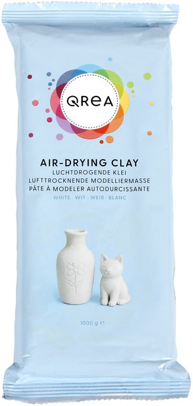Luchtdrogende klei Qrea wit – 1000 gramOntdek de veelzijdigheid van Qrea luchtdrogende klei, ideaal voor creatieve projecten zonder oven! Deze witte klei is gemaakt van natuurlijke grondstoffen en is zowel glutenvrij als vegan. De klei hardt vanzelf uit door blootstelling aan lucht, waardoor bakken overbodig is. Dankzij de fijne structuur plakt hij niet aan de handen, vlekt niet en laat zich eenvoudig uit kleding wassen. De klei hecht goed op vrijwel elke ondergrond en is na droging overschilderbaar. Iets ingedroogd materiaal kun je weer soepel maken met een beetje water. Voor een duurzaam resultaat kun je het eindwerk aflakken met vernis.Kenmerken: