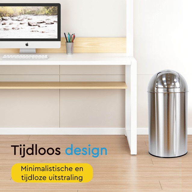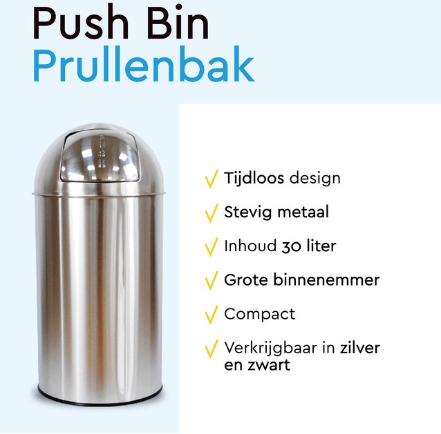 De BRASQ Push Bin Prullenbak 30 Liter is dé perfecte combinatie van design, gemak en functionaliteit. Of je nu een moderne keuken, strak kantoor of gezellige bijkeuken hebt: deze touch bin voelt zich overal thuis. Dankzij het minimalistische design, de slimme bediening en de royale inhoud is dit dé afvaloplossing voor wie houdt van orde, stijl én eenvoud. Tijdloos design: Deze push bin prullenbak is ontworpen met oog voor detail én gevoel voor stijl. De minimalistische en tijdloze uitstraling zorgt ervoor dat hij moeiteloos opgaat in elk interieur – van landelijk tot industrieel, van modern tot klassiek. Het strakke silhouet en de subtiele afwerking maken deze prullenbak tot een echte eyecatcher, zónder te overheersen. Een slimme keuze voor wie functionaliteit én uitstraling belangrijk vindt. Materiaal: De BRASQ Push Bin is vervaardigd van stevig RVS, wat niet alleen bijdraagt aan een luxe uitstraling, maar ook garant staat voor een lange levensduur. De robuuste constructie van de afvalemmer is bestand tegen dagelijks gebruik, terwijl de gladde afwerking zorgt voor een hygiënische én onderhoudsvriendelijke ervaring. Een investering voor een keuken of badkamer prullenbak waar je jarenlang plezier van hebt. Grote binnenemmer: Dankzij de ruime inhoud van 30 liter van deze zwarte prullenbak hoef je minder vaak te legen, ideaal voor drukke huishoudens of werkplekken. De stalen binnenemmer is perfect passend en voorzien van een handige hendel. Daardoor haal je hem eenvoudig uit de buitenbak om te legen of schoon te maken. Kortom: geen gedoe, wél gemak. De perfect sluitende deksel houdt bovendien nare geurtjes netjes binnenboord. Gebruiksgemak: De touch bin opent met een simpele duw tegen de voorzijde van de klep – geen voetsysteem of losliggende deksel dus. Dankzij het compacte ontwerp en de stabiele voet met antikrasrand past deze pedaalemmer zelfs in kleinere ruimtes, zonder in te leveren op gebruiksgemak of capaciteit. Functioneel én comfortabel in gebruik, iedere dag opnieuw. Afmeting product: Ø29,5 x 72 cm (h)
