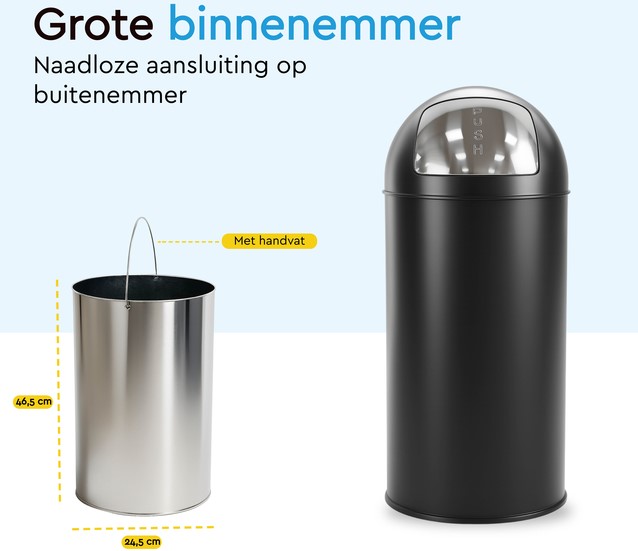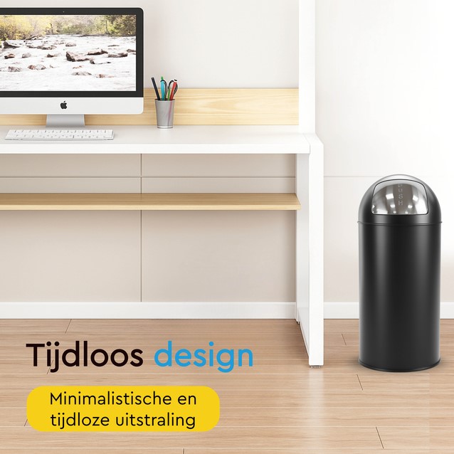 De BRASQ Push Bin Prullenbak 30 Liter is dé perfecte combinatie van design, gemak en functionaliteit. Of je nu een moderne keuken, strak kantoor of gezellige bijkeuken hebt: deze touch bin voelt zich overal thuis. Dankzij het minimalistische design, de slimme bediening en de royale inhoud is dit dé afvaloplossing voor wie houdt van orde, stijl én eenvoud. Tijdloos design: Deze push bin prullenbak is ontworpen met oog voor detail én gevoel voor stijl. De minimalistische en tijdloze uitstraling zorgt ervoor dat hij moeiteloos opgaat in elk interieur – van landelijk tot industrieel, van modern tot klassiek. Het strakke silhouet en de subtiele afwerking maken deze prullenbak tot een echte eyecatcher, zónder te overheersen. Een slimme keuze voor wie functionaliteit én uitstraling belangrijk vindt. Materiaal: De BRASQ Push Bin is vervaardigd van stevig RVS poedergecoat zwart, wat niet alleen bijdraagt aan een luxe uitstraling, maar ook garant staat voor een lange levensduur. De robuuste constructie van de afvalemmer is bestand tegen dagelijks gebruik, terwijl de gladde afwerking zorgt voor een hygiënische én onderhoudsvriendelijke ervaring. Een investering voor een keuken of badkamer prullenbak waar je jarenlang plezier van hebt. Grote binnenemmer: Dankzij de ruime inhoud van 30 liter van deze zwarte prullenbak hoef je minder vaak te legen, ideaal voor drukke huishoudens of werkplekken. De stalen binnenemmer is perfect passend en voorzien van een handige hendel. Daardoor haal je hem eenvoudig uit de buitenbak om te legen of schoon te maken. Kortom: geen gedoe, wél gemak. De perfect sluitende deksel houdt bovendien nare geurtjes netjes binnenboord. Gebruiksgemak: De touch bin opent met een simpele duw tegen de voorzijde van de klep – geen voetsysteem of losliggende deksel dus. Dankzij het compacte ontwerp en de stabiele voet met antikrasrand past deze pedaalemmer zelfs in kleinere ruimtes, zonder in te leveren op gebruiksgemak of capaciteit. Functioneel én comfortabel in gebruik, iedere dag opnieuw. Afmeting product: Ø29,5 x 72 cm (h)