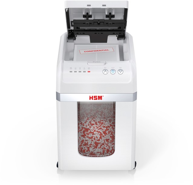De datavernietiger met automatische invoer versnippert tot 200 vellen in snippers in veiligheidsniveau P-4 (4x12mm), wat zorgt voor AVG/GDPR-conforme gegevensbeveiliging.