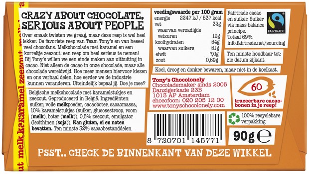 Over smaak twisten we graag, maar deze reep is wel heel lekker. De favorite reep van Team Tony's en van heeeel veel chocofans. Melkcholade met karamel een een korreltje zeezout: een reep om heel serieus te nemen. Nu in 'n kleiner reepje!Tony's chocolonely - samen maken we een einde aan uitbuiting in cacao! Bij tony's willen we een einde maken aan uitbuiting in cacao. Niet alleen de cacao in onze chocolade, maar alle chocolade wereldwijd. Hoe meer mensen hiervoor kiezen en ons verhaal delen, hoe eerder we de industrie kunnen veranderen. Uiteindelijk bepaal jij, doe je mee?