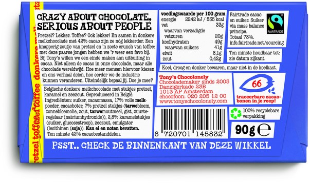 Pretzel? Lekker. Toffee? Ook lekker! En samen in donkere melkchocolade met 42% cacao zijn ze nòg lekkerder. Een knapperig zoutje van pretzel en 'n zoete crunch van toffee: met deze paarse jongen hebben we 'r weer een favo bij. Nu in 'n kleiner reepje!Tony's chocolonely - samen maken we een einde aan uitbuiting in cacao! Bij tony's willen we een einde maken aan uitbuiting in cacao. Niet alleen de cacao in onze chocolade, maar alle chocolade wereldwijd. Hoe meer mensen hiervoor kiezen en ons verhaal delen, hoe eerder we de industrie kunnen veranderen. Uiteindelijk bepaal jij, doe je mee?