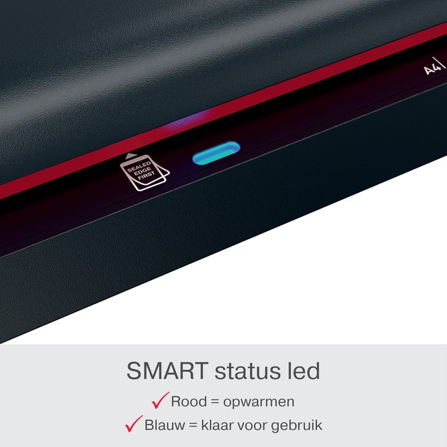 SMART status led: brandt rood tijdens het opwarmen en wordt blauw met een geluidssignaal wanneer de lamineermachine klaar is voor gebruik.