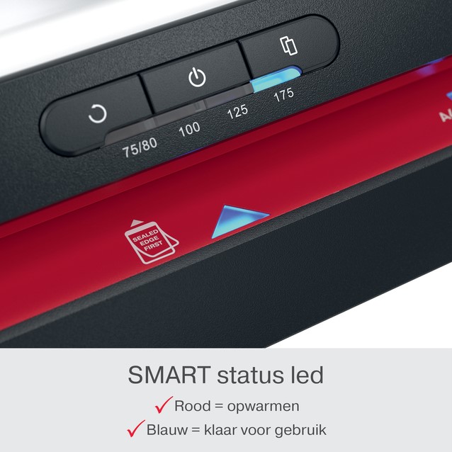 SMART status led: brandt rood tijdens het opwarmen en wordt blauw met een geluidssignaal wanneer de lamineermachine klaar is voor gebruik.