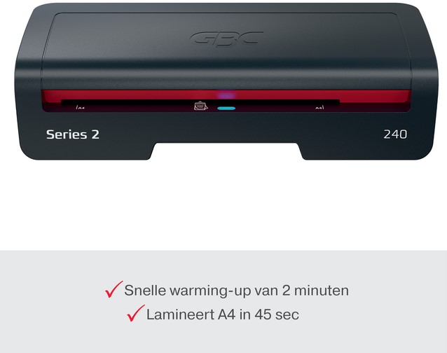 De GBC 240 is een slanke en efficiënte oplossing voor je dagelijkse lamineerbehoeften. Deze A4 lamineermachine is ontworpen met zowel stijl als prestaties in gedachten en is ideaal voor gebruik thuis of op kantoor aan huis. Met een snelle opwarmtijd van 2 minuten lamineert hij een A4 vel van 75 micron in slechts 45 seconden, waardoor hij perfect is voor het efficiënt afhandelen van je thuisprojecten. De gebruiksvriendelijke bedieningsschakelaar biedt drie instellingen voor lamineerhoesdikte van 75-125 micron, wat flexibiliteit biedt voor verschillende soorten documenten. Een anti-vastloop ontgrendelingshendel zorgt voor een soepele werking door het moeiteloos oplossen van verkeerd geplaatste lamineerhoezen. Bovendien vereenvoudigt het SMART status ledsysteem de bediening met duidelijke visuele en auditieve signalen: rood tijdens het opwarmen, blauw met een geluid wanneer de machine klaar is en een automatische uitschakeling na 15 minuten inactiviteit om energie te besparen. Bescherm en bewaar je belangrijke documenten met een perfecte afwerking, elke keer weer.