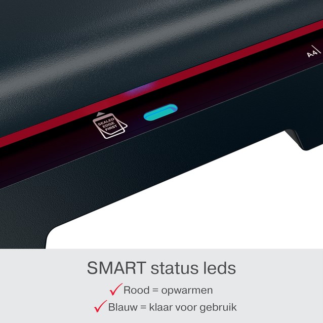 SMART status led: brandt rood tijdens het opwarmen en wordt blauw met een geluidssignaal wanneer de lamineermachine klaar is voor gebruik.