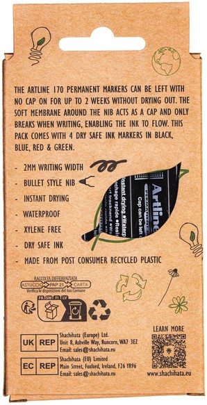 Ecologische Permanent Markers gemaakt uit 65.6% gerecycled materiaal met Dry-Safe inkt die 2 weken zonder dop kunnen blijven zonder uit te drogen. Konische punt 2mm. Kleur : zwart – rood – blauw – groen. Verpakt in Kraft doosje. Gecertifieerd door Eco Mark-label. Post consumer recycled plastic.