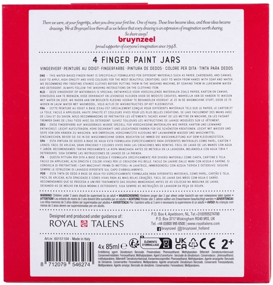 Deze vingerverfset op waterbasis bevat 4 levendige kleuren: rood, groen, geel en blauw. Speciaal samengesteld voor verschillende materialen zoals papier, karton en canvas. Klaar voor gebruik en gemakkelijk aan te brengen, biedt het een hoge dekkracht en levendige kleuren voor de mooiste creaties. Gemakkelijk van de handen af te wassen met water en zeep. Inhoud: 4 x 85 ml. Praktisch plezier: kinderen gebruiken hun handen in plaats van penselen, zodat ze de verf kunnen voelen en hun ideeën vrij kunnen uiten. Het draait allemaal om ontdekken en hun fantasie tot leven brengen!Levendige kleuren: bevat 4 heldere en mooie kleuren - rood, groen, geel en blauw - die hun creaties laten opvallen.Hoge dekkracht: biedt levendige kleuren en een hoge dekkracht voor de mooiste kunstwerken.Klaar voor gebruik: geen penselen nodig! Deze verf is klaar voor gebruik en gemakkelijk aan te brengen, zodat kinderen meteen aan de slag kunnen met hun creatieve projecten.Gemakkelijk schoon te maken: gemakkelijk van de handen te wassen met water en zeep, waardoor schoonmaken een fluitje van een cent is voor ouders.Veelzijdig gebruik: perfect voor verschillende materialen zoals papier, karton en canvas, waardoor kinderen vrij kunnen experimenteren met verschillende oppervlakken.