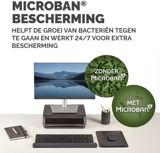 De HEX Cushion Technology™, waarvoor patent is aangevraagd, zorgt voor gelijkmatige ondersteuning en comfort tijdens het typen. De zachte, stofwerende polssteun heeft een mooie afwerking en zorgt voor een soepele typervaring. De ingebouwde Microban®-bescherming helpt bacteriën tegen te gaan en werkt 24/7 voor extra bescherming van het product. 100% recyclebaar via het terugnameprogramma van Fellowes. Gemaakt om lang mee te gaan, met 5 jaar beperkte garantie. Getest door FIRA International Ltd om te voldoen aan de ergonomische eisen van de Europese gezondheids- en veiligheidswetgeving: EN ISO 9241-5.