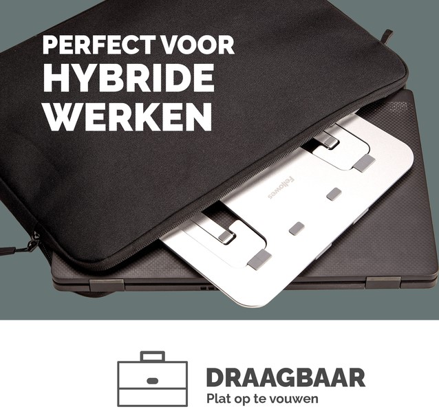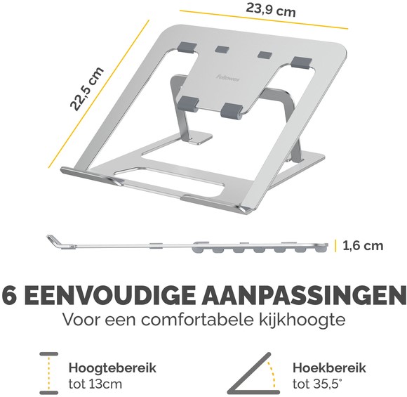 Breng je laptop in een comfortabele kijkpositie, zodat je ogen, nek en schouders minder worden belast. Zes eenvoudig in hoogte te verstellen standen om de schermpositie te optimaliseren. Lichtgewicht ontwerp, plat opvouwbaar voor eenvoudig opbergen of onderweg, perfect voor hybride werken. Anti-slip pads houden de laptop stevig op zijn plaats. Open ontwerp verhoogt de luchtcirculatie om je laptop koel te houden. Gemaakt van 93% gerecycled materiaal. Getest door FIRA International Ltd om te voldoen aan de ergonomische eisen van de Europese gezondheids- en veiligheidswetgeving: EN ISO 9241-5.