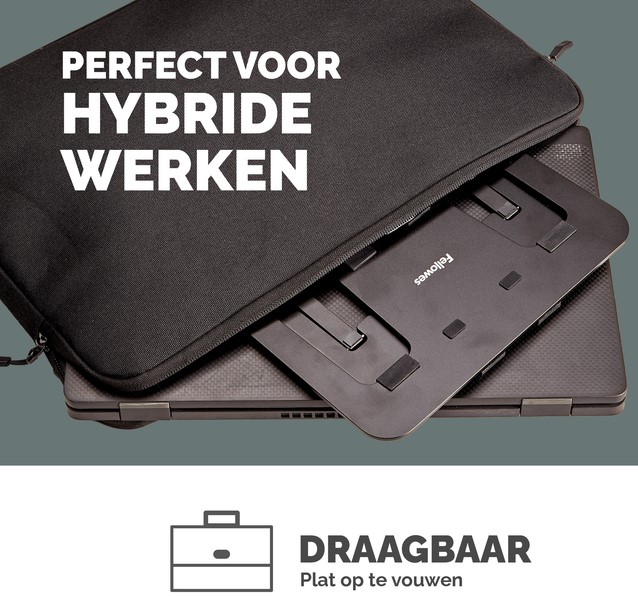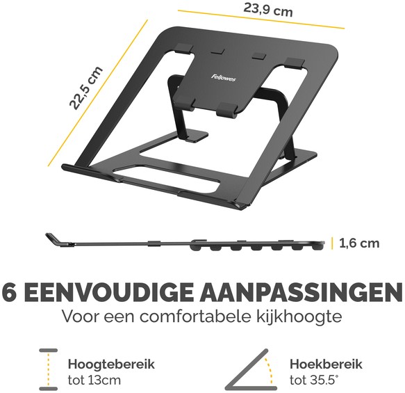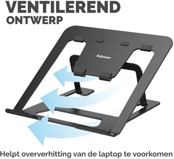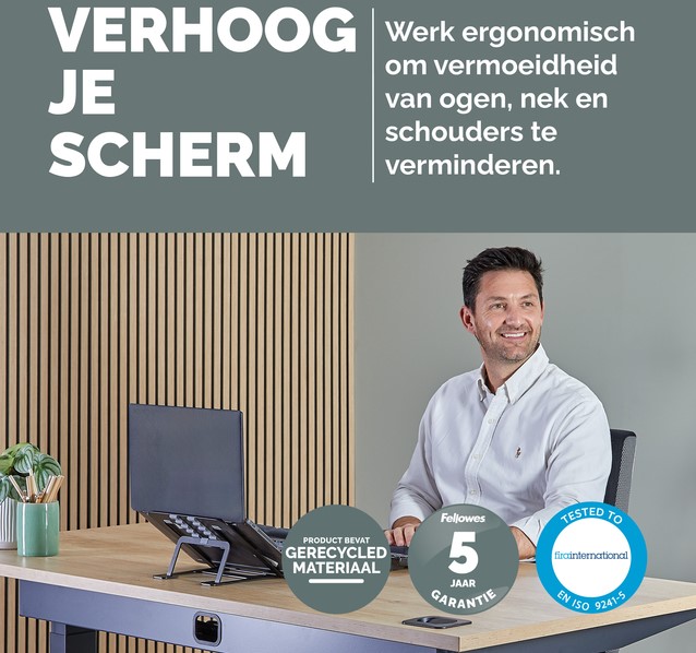 Breng je laptop in een comfortabele kijkpositie, zodat je ogen, nek en schouders minder worden belast. Zes eenvoudig in hoogte te verstellen standen om de schermpositie te optimaliseren. Lichtgewicht ontwerp, plat opvouwbaar voor eenvoudig opbergen of onderweg, perfect voor hybride werken. Anti-slip pads houden de laptop stevig op zijn plaats. Open ontwerp verhoogt de luchtcirculatie om je laptop koel te houden. Gemaakt van 93% gerecycled materiaal.Getest door FIRA International Ltd om te voldoen aan de ergonomische eisen van de Europese gezondheids- en veiligheidswetgeving: EN ISO 9241-5.