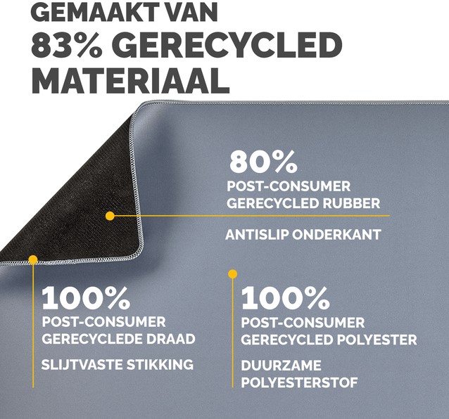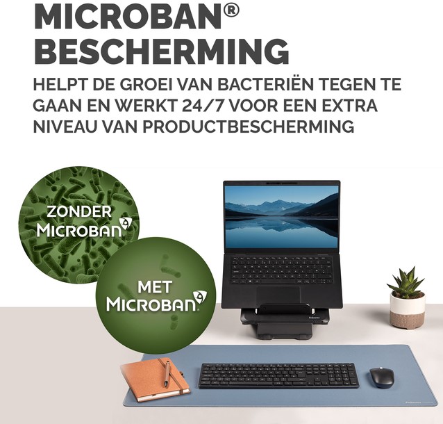 Ruime bureaumat beschermt tegen vuil en krassen en zorgt voor een niet-reflecterend werkoppervlak. Biedt een comfortabel oppervlak om te schrijven en te typen en verbetert de prestaties van de muis. Ingebouwde Microban®-bescherming helpt de groei van bacteriën te voorkomen en werkt 24/7 voor een extra niveau van productbescherming. Gemaakt van 83% gerecycled materiaal. Antislip onderkant houdt de mat de hele dag op zijn plaats. Duurzame platte stiksels voorkomen rafelen. Gemaakt om lang mee te gaan, met 5 jaar garantie.