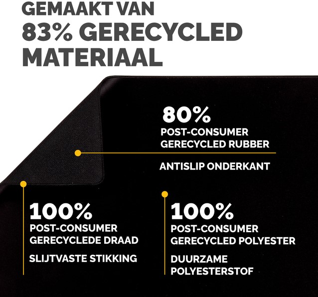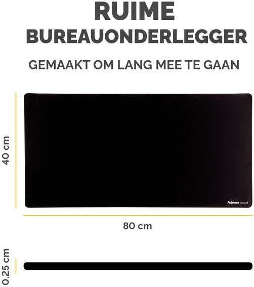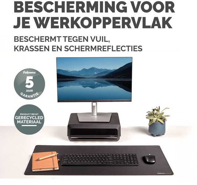 Ruime bureaumat beschermt tegen vuil en krassen en zorgt voor een niet-reflecterend werkoppervlak. Biedt een comfortabel oppervlak om te schrijven en te typen en verbetert de prestaties van de muis. Ingebouwde Microban®-bescherming helpt de groei van bacteriën te voorkomen en werkt 24/7 voor een extra niveau van productbescherming. Gemaakt van 83% gerecycled materiaal. Antislip onderkant houdt de mat de hele dag op zijn plaats. Duurzame platte stiksels voorkomen rafelen. Gemaakt om lang mee te gaan, met 5 jaar garantie.