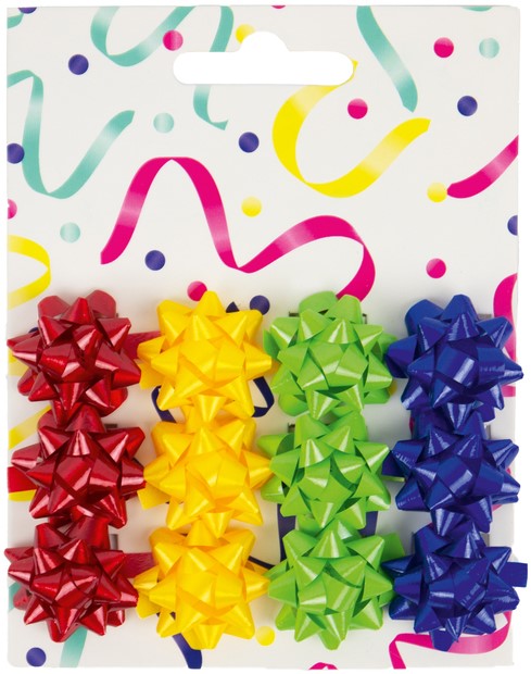 Cadeaustrikken – Set van 12 stuks. Deze set bevat 12 cadeaustrikken in vier vrolijke kleuren: rood, geel, groen en blauw. Ideaal voor het snel en netjes decoreren van cadeaus bij diverse gelegenheden. Productvoordelen: