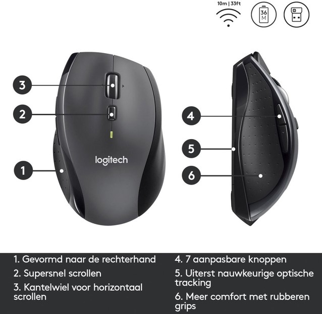 Batterijlevensduur kan variëren, afhankelijk van gebruiks- en computeromstandigheden). Het ergonomische ontwerp ligt prettig in de hand en biedt langdurig comfort, perfect voor intensief dagelijks gebruik. Met vijf knoppen, een supersnel scrolwiel en kantelfunctie navigeer je moeiteloos door documenten en webpagina’s. De nauwkeurige optische tracking zorgt voor vloeiende bewegingen, terwijl de betrouwbare USB-ontvanger zorgt voor een stabiele draadloze verbinding. Deze muis is een echte krachtpatser die comfort en efficiëntie perfect combineert.Kenmerken: