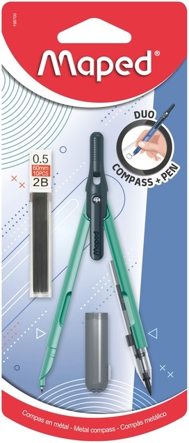 Penpasser : compact, functioneel en veilig met dop. Sterke metalen passerbenen. Handig met het automatisch vulpotlood. En navulbaar met bijgeleverde potloodmines 0,5mm