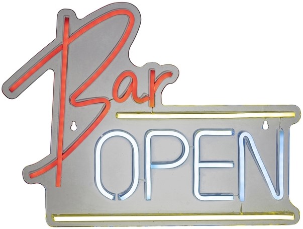 Neon ledbord met de tekst: Bar Open. Een kleurrijk spel van licht dat levendigheid en sfeer brengt in elke kamer. Deze Lumineo Neon is ontworpen voor binnengebruik en werkt op batterijen, met prioriteit voor flexibiliteit en gemak. De verlichting, met 220 kleine SMD LED's, straalt een speels palet van meerdere kleuren uit en zorgt voor een opvallende, stijlvolle uitstraling. Dankzij het lichte plastic en het wit aansluitsnoer past deze decoratie moeiteloos in diverse interieurs, terwijl de eenvoudige bediening direct comfort en plezier biedt.USB aansluiting
