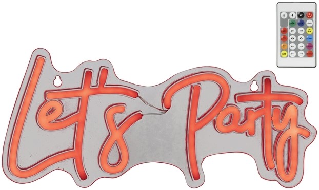 Neon ledbord met de tekst: Let's Party. Een levendig kleurenspel brengt elke kamer tot leven met deze stijlvolle Lumineo Neon B verlichting. Dankzij USB-voeding en de meegeleverde infrarood afstandsbediening zijn flexibiliteit en eenvoudig gebruik gegarandeerd—ideaal voor binnenruimtes zoals woonkamers of speelruimtes. Het kleurveranderende LED-licht zorgt voor steeds wisselende sferen, ondersteund door maar liefst 114 SMD-lampen in een speels ontwerp op een bruin plastic frame. Met een lengte van 41 cm en een compact formaat voegt dit verlichtingsobject een trendy en modern accent toe aan elk interieur.