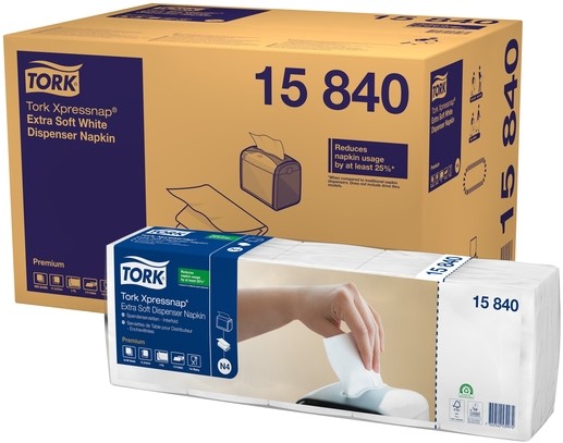 Tork Xpressnap® Extra Zachte Dispenserservet Wit N4: Drukbezochte zelfbedieningsruimten vragen om hoogwaardige papieren servetten die geen onnodige kosten en afval creëren. Onze Xpressnap® Extra Zachte Dispenserservetten zijn zacht en dik en maken een blijvende indruk op gasten. Ze zijn te gebruiken met al onze Xpressnap® dispensers, die de hygiëne verbeteren omdat gasten alleen hun eigen servet aanraken. De één-per-keer-dosering bespaart bovendien kosten, doordat 25% minder servetten wordt verbruikt dan met traditionele servettendispensers.De voordelen op een rijtje: