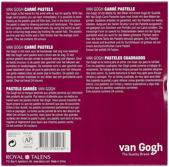 Van Gogh Carré pastels zijn harde, vierkante pastels die uitermate geschikt zijn voor het bedekken van grote oppervlakken bij gebruik van de zijkant of voor gedetailleerd werk bij gebruik van de hoeken en randen. Dit zijn droge, maar zeer stevige pastels. De kleuren hebben een goede lichtechtheidsgraad voor kleurbehoud. Ze kunnen ook met water vermengd worden voor aquareleffecten. Eenvoudig te reinigen na gebruik. Deze reeks is momenteel uitsluitend beschikbaar in sets. Deze algemene selectie-set met 24 pastels bevat de volgende kleuren: Wit (100.5), Citroengeel (205.5), Geel (200.5), Donkergeel (202.5), Oranje (235.5), Vermiljoen (311.5), Permanentrood (372.5), Karmijn (318.5), Rose (357.5), Roodviolet (545.5), Blauwviolet (548.5), Briljantblauw (564.5), Phtaloblauw (570.5), Ultramarijn (504.5), Pruisischblauw (508.5), Permanentgroen licht (618.5), Turkooisgroen (661.5), Permanentgroen donker (619.5), Olijfgroen (620.5), Gele oker (227.5), Sienna gebrand (411.5), Omber gebrand (409.5), Omber groenachtig(3) (410.3), Zwart (700.5).