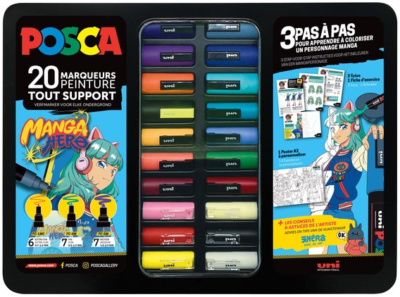 In deze metalen koffer zitten maar liefst 20 posca's in manga kleuren!