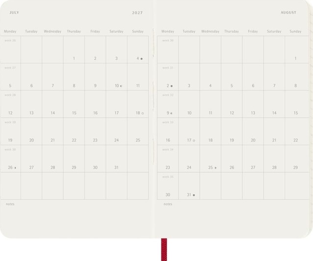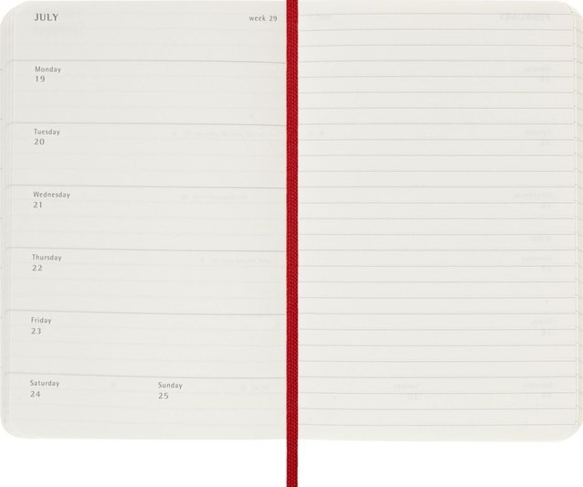 De Moleskine Weekly Notebook Planner is gedateerd van januari tot december. Het is een handige en veelzijdige planner die de vrijheid van een notitieboekje bevat en is ingedeeld met de afspraken van de week aan de linkerkant en een gelinieerde pagina voor notities op de rechter bladzijde. Het notitieboekje is beschikbaar met een harde of een zachte kaft met afgeronde hoeken en een elastische sluiting.- Harde of Zachte kaft- Afgeronde hoeken- Elastische sluiting- Moleskine ivoorkleurig papier- Papiergewicht: 70 g/m²- Handige tools: planning, tijdzones, internationale metingen, toegangscodes en vluchtduur- Uitbreidbaar binnenvak passend bij de kleur van het notebook- "In geval van verlies" label gedrukt op het schutblad- Bijpassende bladwijzer voor lint- Herbruikbare paperband B-SIDE met extra gedrukte tools- 180° liggende opening- Moleskine srl. creëert en verkoopt FSC-gecertificeerde producten