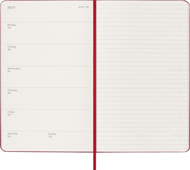 De Moleskine Weekly Notebook Planner is gedateerd van januari tot december. Het is een handige en veelzijdige planner die de vrijheid van een notitieboekje bevat en is ingedeeld met de afspraken van de week aan de linkerkant en een gelinieerde pagina voor notities op de rechter bladzijde. Het notitieboekje is beschikbaar met een harde of een zachte kaft met afgeronde hoeken en een elastische sluiting.- Harde of Zachte kaft- Afgeronde hoeken- Elastische sluiting- Moleskine ivoorkleurig papier- Papiergewicht: 70 g/m²- Handige tools: planning, tijdzones, internationale metingen, toegangscodes en vluchtduur- Uitbreidbaar binnenvak passend bij de kleur van het notebook- "In geval van verlies" label gedrukt op het schutblad- Bijpassende bladwijzer voor lint- Herbruikbare paperband B-SIDE met extra gedrukte tools- 180° liggende opening- Moleskine srl. creëert en verkoopt FSC-gecertificeerde producten